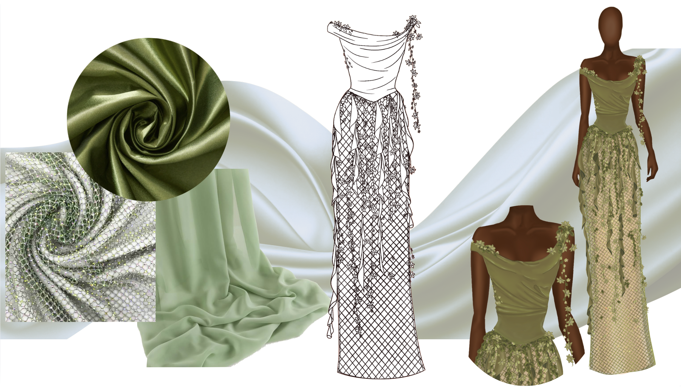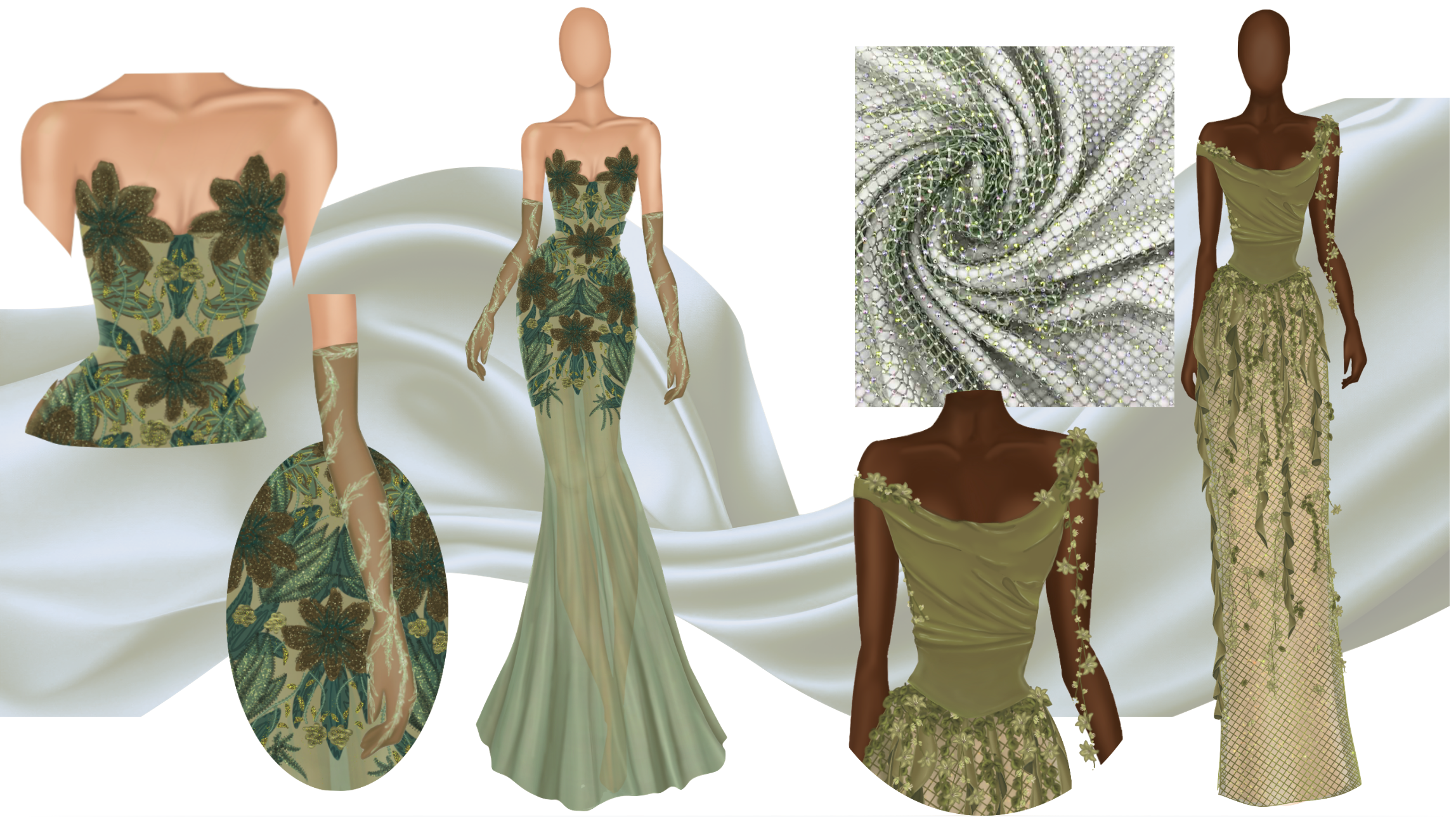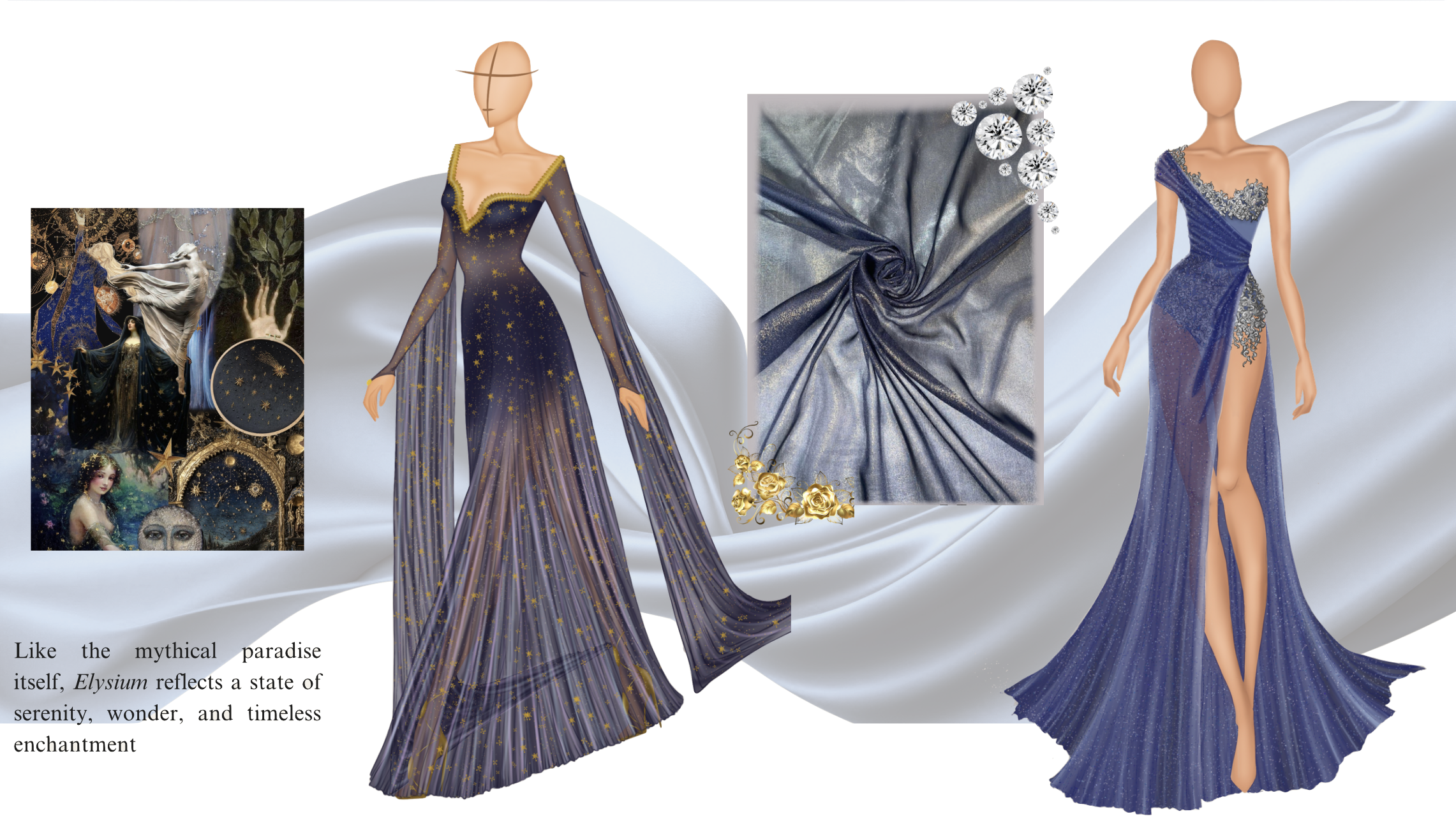 Elysium is a collection inspired by the ethereal beauty of forest and night-sky nymphs in Greek mythology—beings who embody grace, enchantment, and the eternal allure of nature. Each garment is designed to capture the essence of their ideal state, one which radiates perpetual grace, beauty, and harmony. Like the mythical paradise itself, Elysium invites the wearer into a world of enchantment, where elegance feels eternal and fantasy becomes reality.